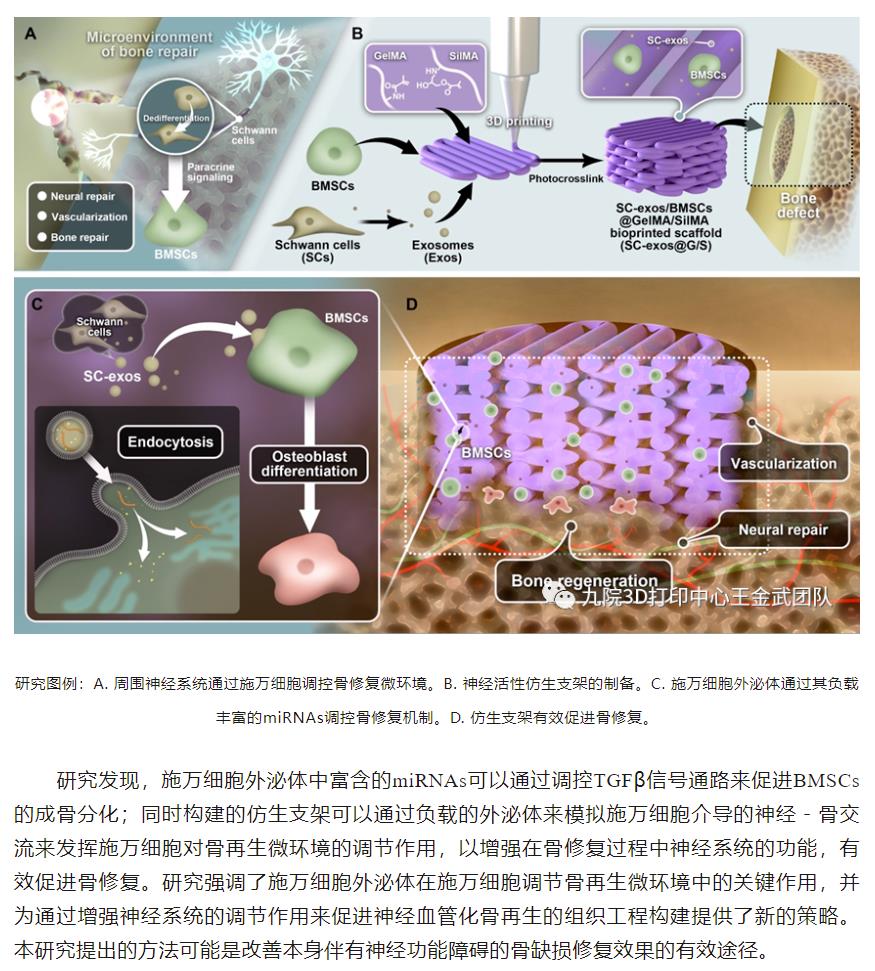 神经对骨修复具有重要的调控作用,然而骨组织工程的研究中很少涉及神经和骨交流的深入探究,所设计的组织工程骨通常缺乏神经活性。施万细胞被证实可以通过旁分泌的外泌体促进骨修复,这可能是神经调控骨修复的重要途径。因此,上海交通大学医学院附属第九人民医院骨科王金武教授、戴尅戎院士团队针对施万细胞外泌体促进骨修复的可能作用方式及分子生物学机制进行了探究,并使用GelMA和SilMA组成的混合水凝胶负载BMSCs和施万细胞外泌体制成生物墨水,通过生物3D打印制造出神经活性的仿生支架。