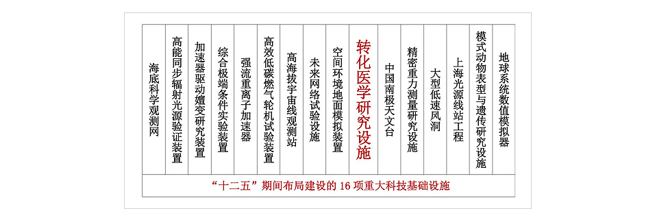 “十二五”时期,在我国科技发展急需、具有相对优势和科技突破先兆显现的领域中,综合考虑科学目标、技术基础、科研需求和人才队伍等因素,优先安排16项重大科技基础设施建设。其中现代医学方面,建设转化医学研究设施,从分子、细胞、组织、个体等方面系统认识人类疾病发生、发展与转归的规律,促进生物医学基础研究成果快速转化为临床诊疗技术。